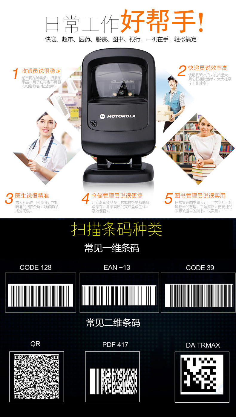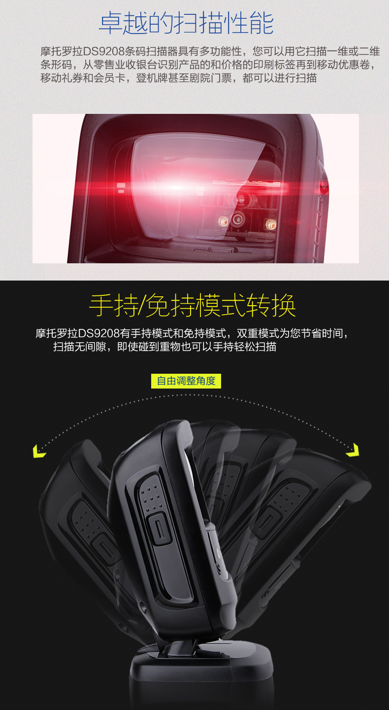 無論您需要掃描紙質(zhì)標(biāo)簽上的條形碼還是手機(jī)屏幕上的條形碼,有了摩托羅拉DS9208,您都可以得心應(yīng)手。摩托羅拉 DS9208 具有多功能性,您可以用它掃描一維或二維條形碼- 從零售業(yè)收銀臺識別產(chǎn)品的和價格的印刷標(biāo)簽再到移動優(yōu)惠券、移動禮券和會員卡、登機(jī)牌甚至劇院門票,都可以進(jìn)行掃描。
