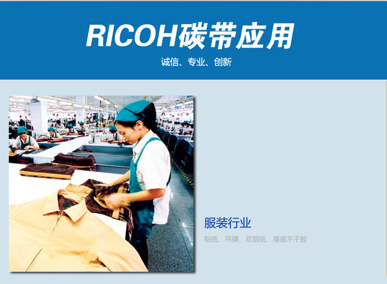 色帶系列材質(zhì)選擇顏色性能特點:理光碳帶特點:1、優(yōu)秀耐磨擦、耐腐蝕性能,具有廣泛的應用領(lǐng)域。2、高度分辨率適合打印標準及旋轉(zhuǎn)條型碼。3、能滿足不同被打印材質(zhì)的需求。4、高敏感度確保優(yōu)異的打印效果。5、防靜電背涂層,有效保護打印頭?;旌匣a(chǎn)品顏色碳帶等級耐臟及耐熱性特性應用B110A黑蠟與樹脂混合基50℃(