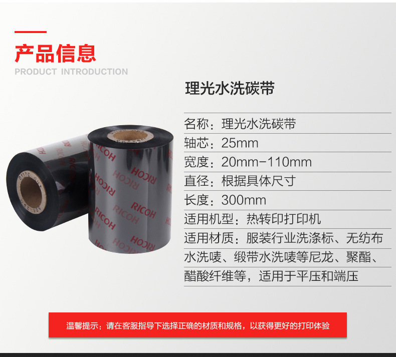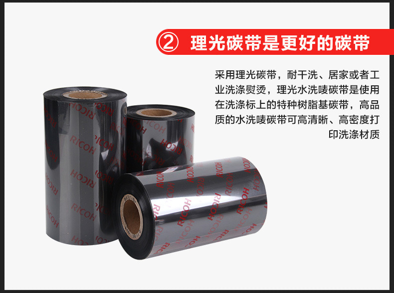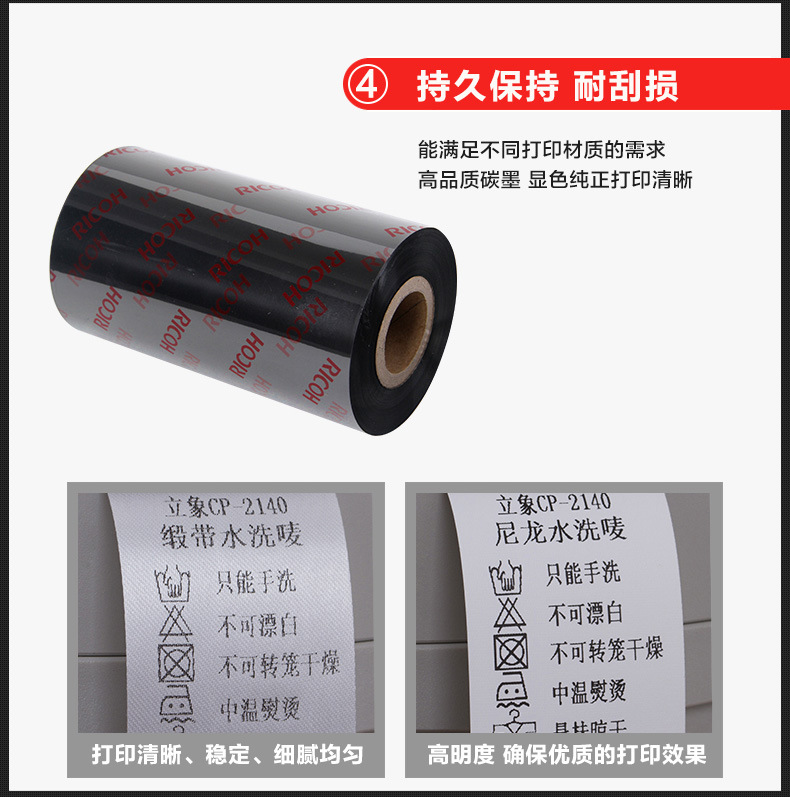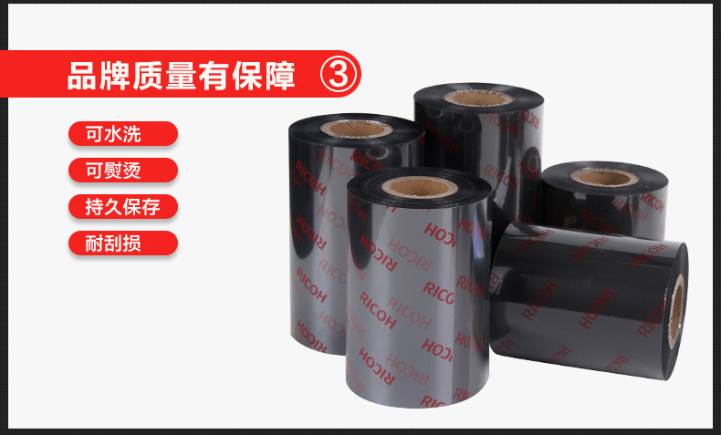 色帶系列材質(zhì)選擇顏色性能特點:理光碳帶特點:1、優(yōu)秀耐磨擦、耐腐蝕性能,具有廣泛的應(yīng)用領(lǐng)域。2、高度分辨率適合打印標準及旋轉(zhuǎn)條型碼。3、能滿足不同被打印材質(zhì)的需求。4、高敏感度確保優(yōu)異的打印效果。5、防靜電背涂層,有效保護打印頭?;旌匣a(chǎn)品顏色碳帶等級耐臟及耐熱性特性應(yīng)用B110A黑蠟與樹脂混合基50℃(