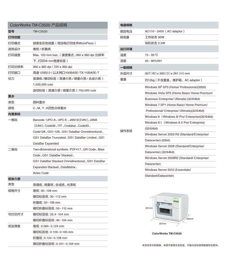 引領(lǐng)彩色標(biāo)簽時(shí)代,全能打印解決方案TM-C3520作為愛普生彩色標(biāo)簽領(lǐng)域的新一代產(chǎn)品,秉承愛普生微壓電打印技術(shù),再配以獨(dú)特的4色分體墨盒和自動(dòng)切刀 設(shè)計(jì),在提供用戶高質(zhì)量彩色標(biāo)簽按需輸出的同時(shí),有效降低TCO(綜合使用成本)。TM-C3520為化工行業(yè)、制造行業(yè)、鞋服類行業(yè)、零售行業(yè)等行業(yè)提供了高生產(chǎn)力,低 TCO&nb