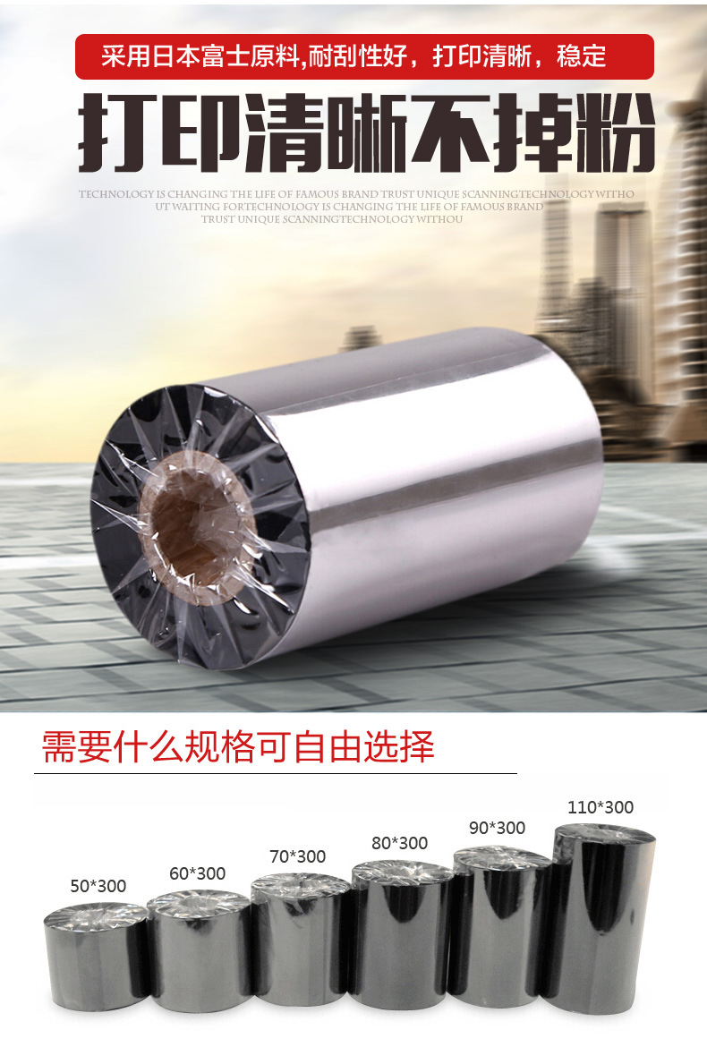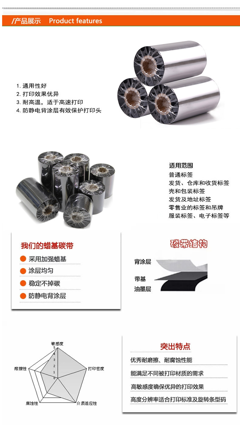 標準蠟基碳帶產(chǎn)品特點:廣泛的標簽適應(yīng)性,通用性好,打印效果優(yōu)異,成本經(jīng)濟,耐高溫,可適用于高速打印。適用范圍廣,可適應(yīng)不同被打材質(zhì)。防靜電背涂層易于有效保護打印頭。適用場合:發(fā)貨、倉庫和收貨標簽 外殼和包裝標簽零.售業(yè)的標簽和吊牌 服裝標簽等適用介質(zhì):涂層紙標簽和吊牌(熱轉(zhuǎn)印紙、普通銅版紙)聚乙烯薄膜(P